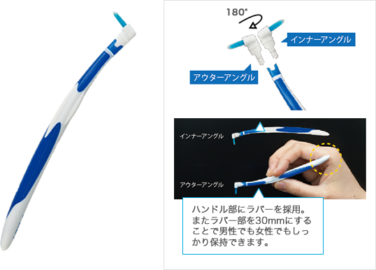 歯周ポケット、インプラント、補綴物周囲等、ペリオリスクの高い部位を低侵襲的にケアする新しいタイプのブラシです。 ●歯周ポケット等へ挿入しやすい、テーパー毛 ●歯肉にもやさしい、やらかめの毛のかたさ ●プラークを確認しやすいブルーのブラシ ●すき間に入りやすく、太さが選べる2 サイズ ●使いやすい向きを選べるヘッド(付替えタイプ)